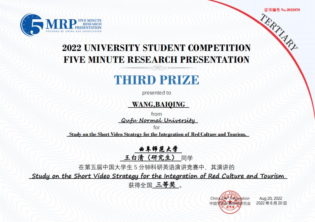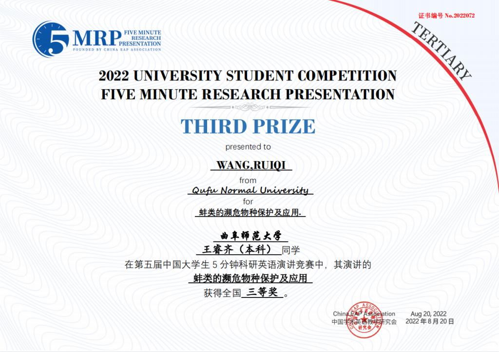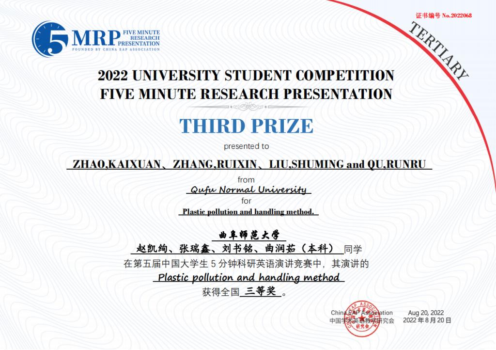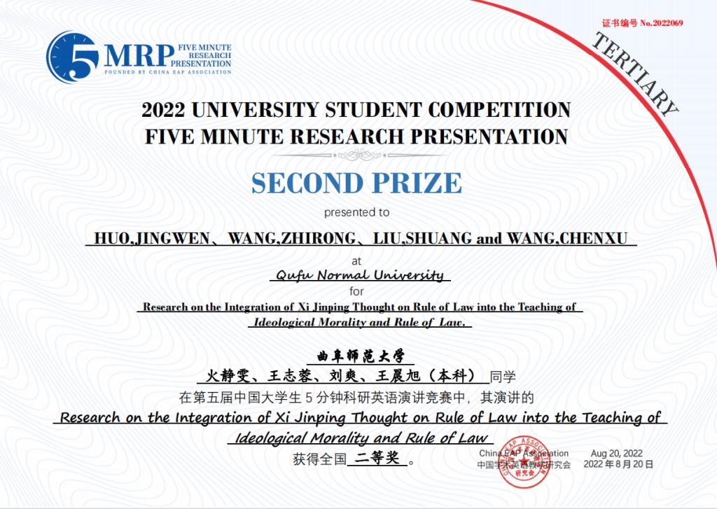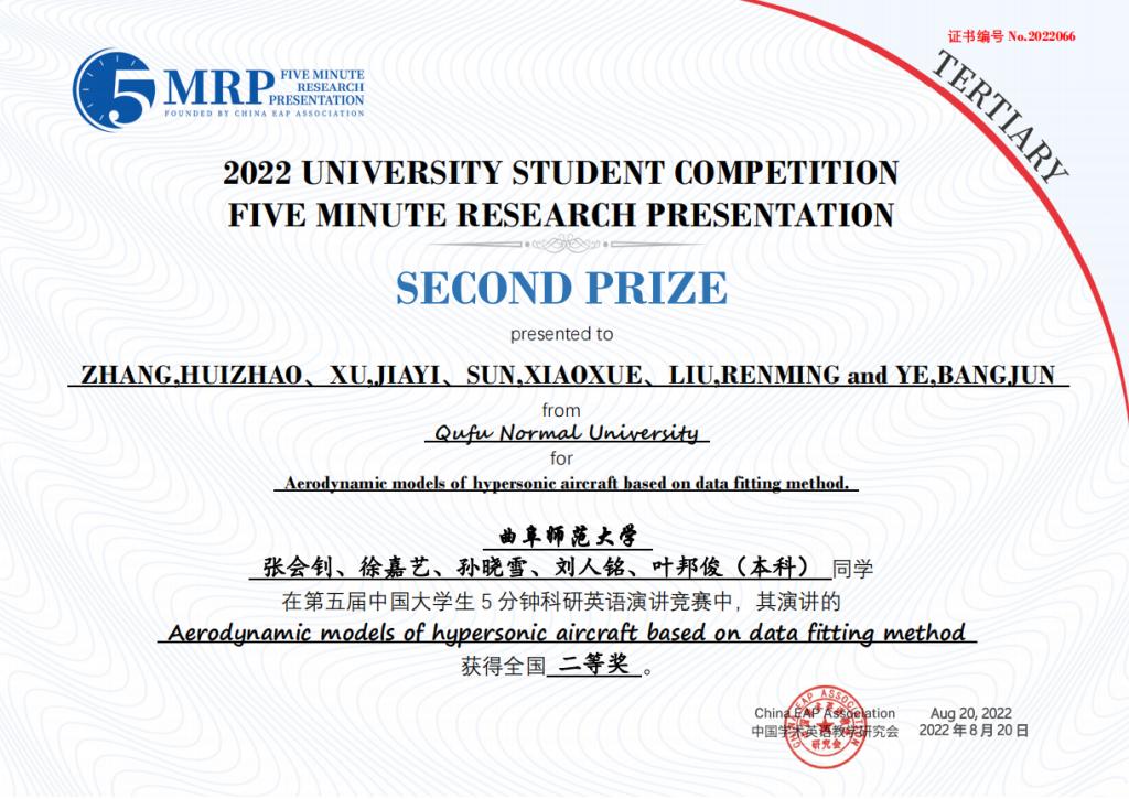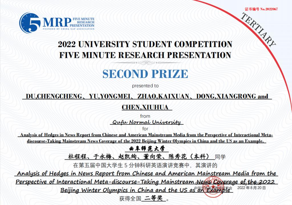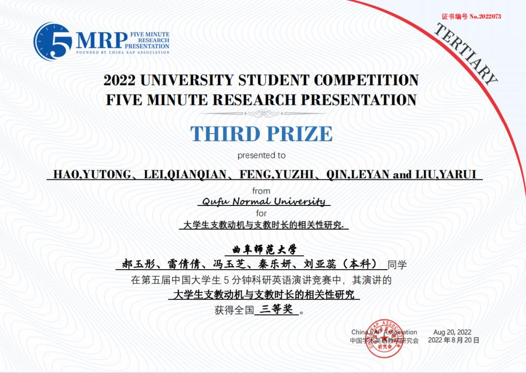 附2:第五届中国大学生五分钟科研英语演讲大赛乐鱼(中国)官方网站获奖团队获奖证书