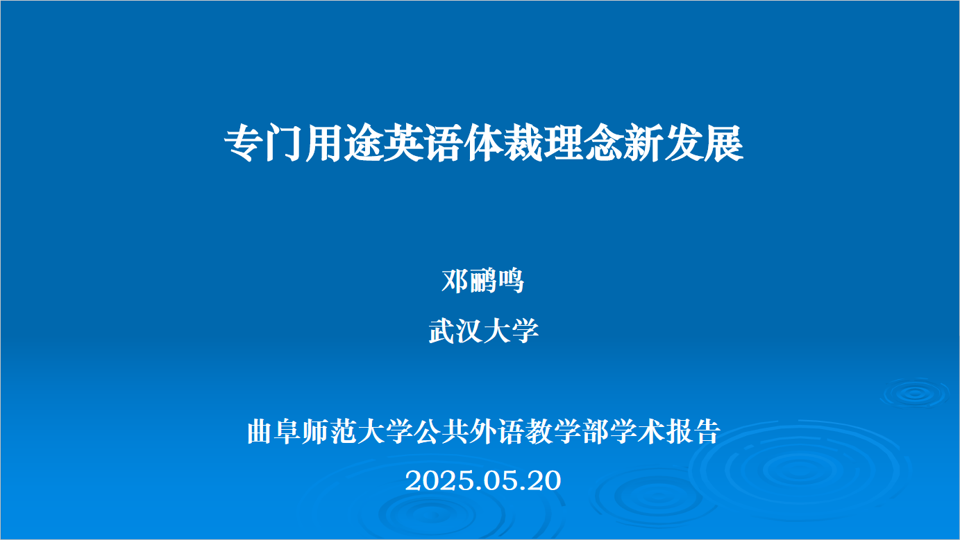 2025年5月20日下午,乐鱼(中国)官方网站乐鱼(中国)官方网站举办70周年校庆系列学术活动暨博雅讲坛第八场。武汉大学邓鹂鸣教授应邀作题为“专门用途英语体裁理念新发展”的学术报告,乐鱼(中国)官方网站全体教师参加活动。