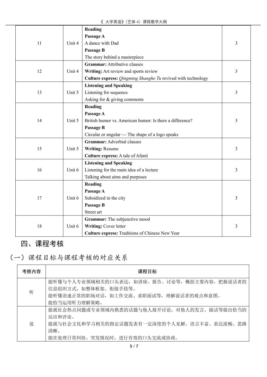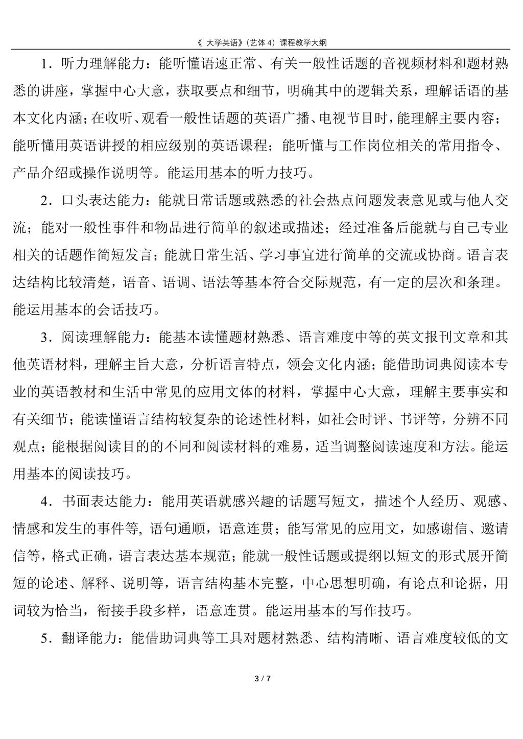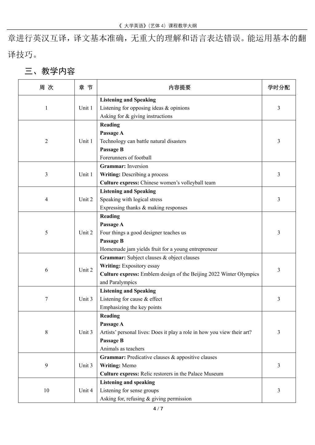 大学英语4(艺体)课程教学大纲(2022版)