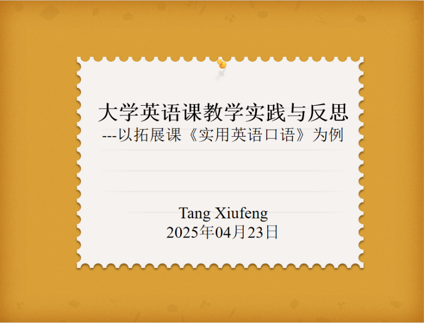 2025423日,乐鱼(中国)官方网站组织全员研训活动,聚焦大学英语教学实践与反思主题。活动中,唐秀峰老师以拓展课《实用英语口语》为例,分享了自己的教学经验与教学反思,为在场教师带来了新思路和新启发。研训中,唐老师从教学准备、课堂管理、技术应用、学生互动和评估反馈等多个关键维度展开分享。